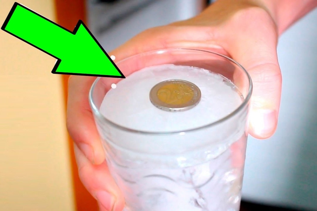 - So führen Sie den Trick durch: Stellen Sie zunächst ein mindestens zur Hälfte mit Wasser gefülltes Glas in den Gefrierschrank und warten Sie, bis es gefroren ist. Wenn es gefroren ist, nehmen Sie es heraus, legen Sie die Münze oben drauf und fertig – Sie können ein paar Tage in den Urlaub fahren.